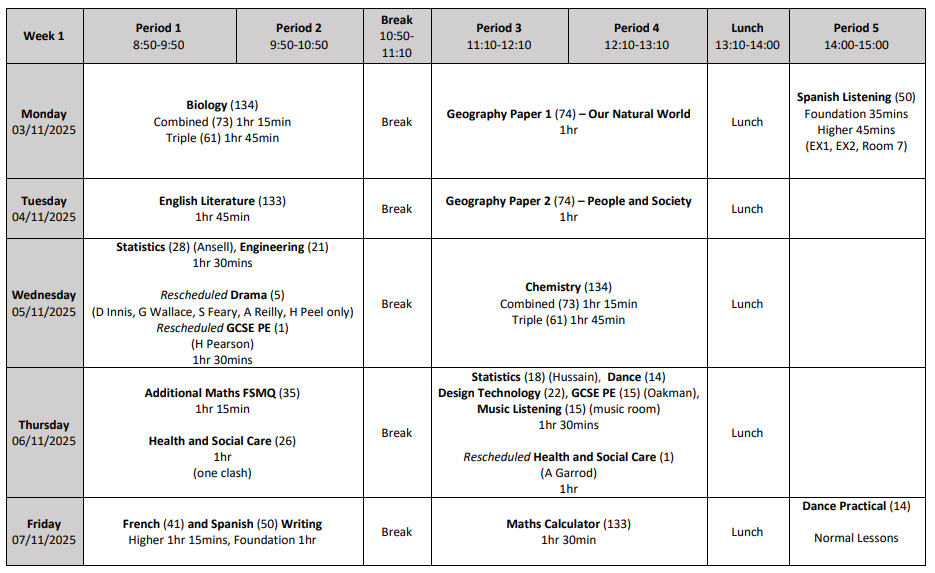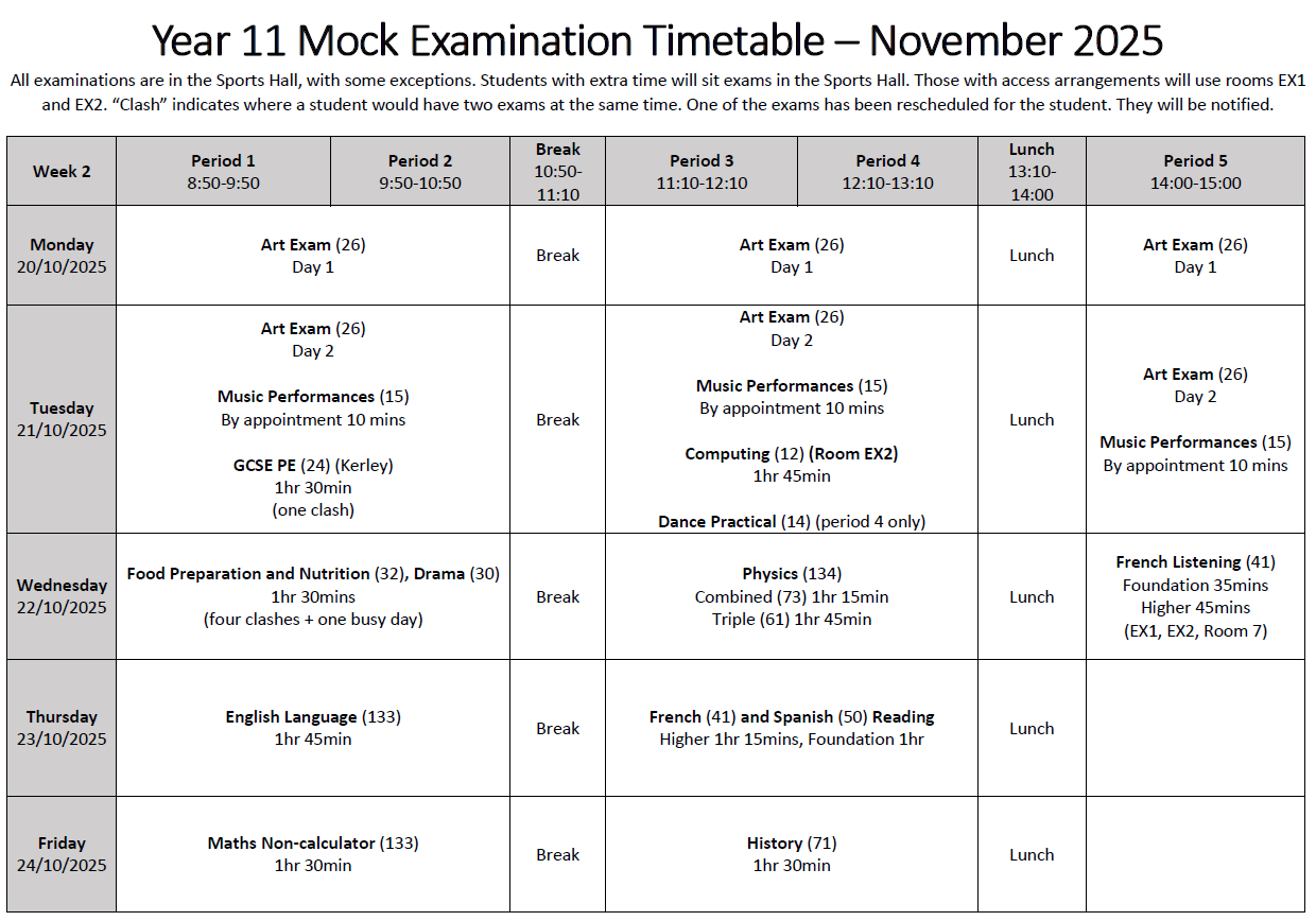 During the mock exam fortnight, your lessons will focus on revision when you are not in an exam. Your teachers will direct you to complete relevant subject revision tasks during lesson time. You will be expected to come equipped to those lessons with revision materials to enable you to study independently.